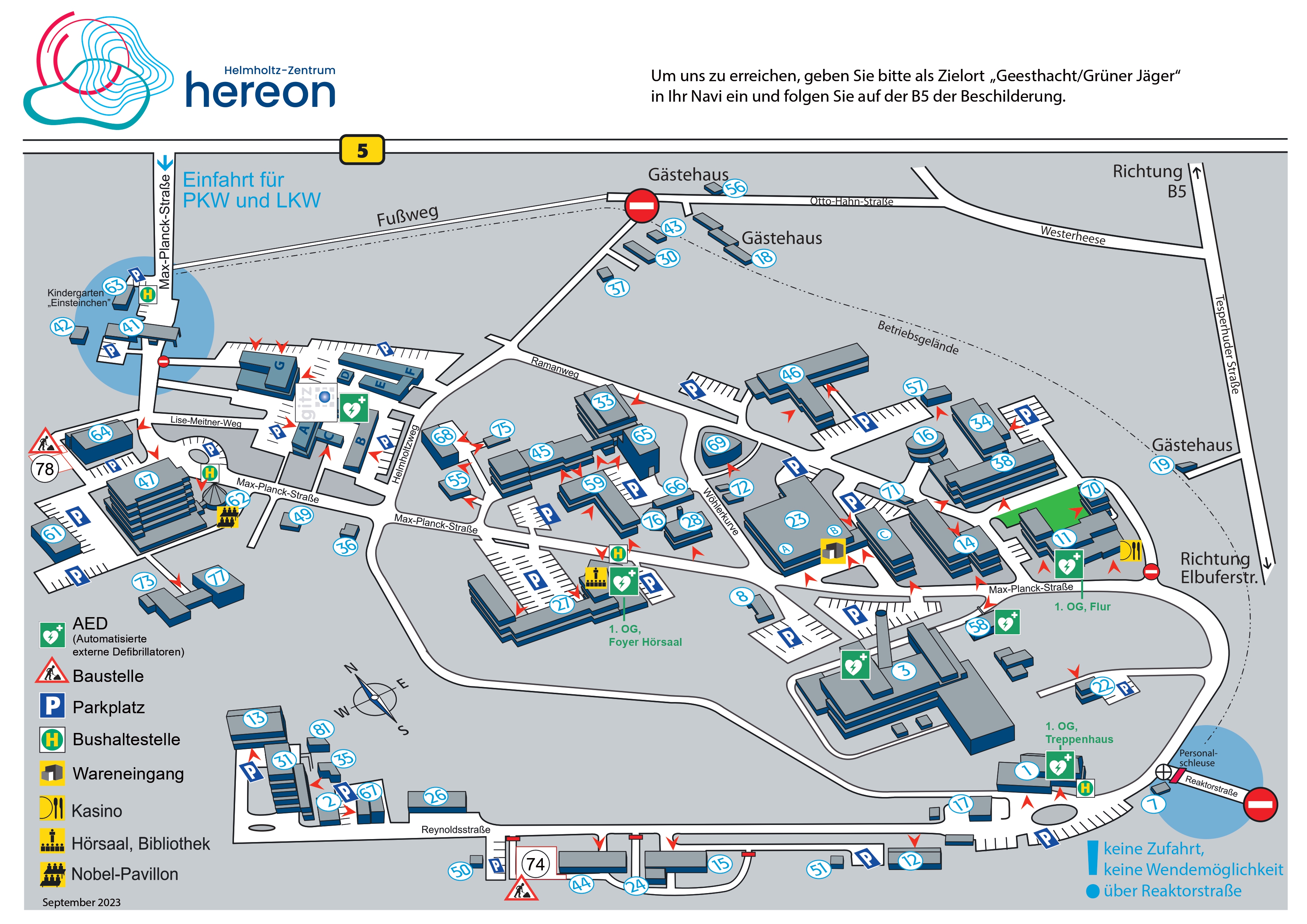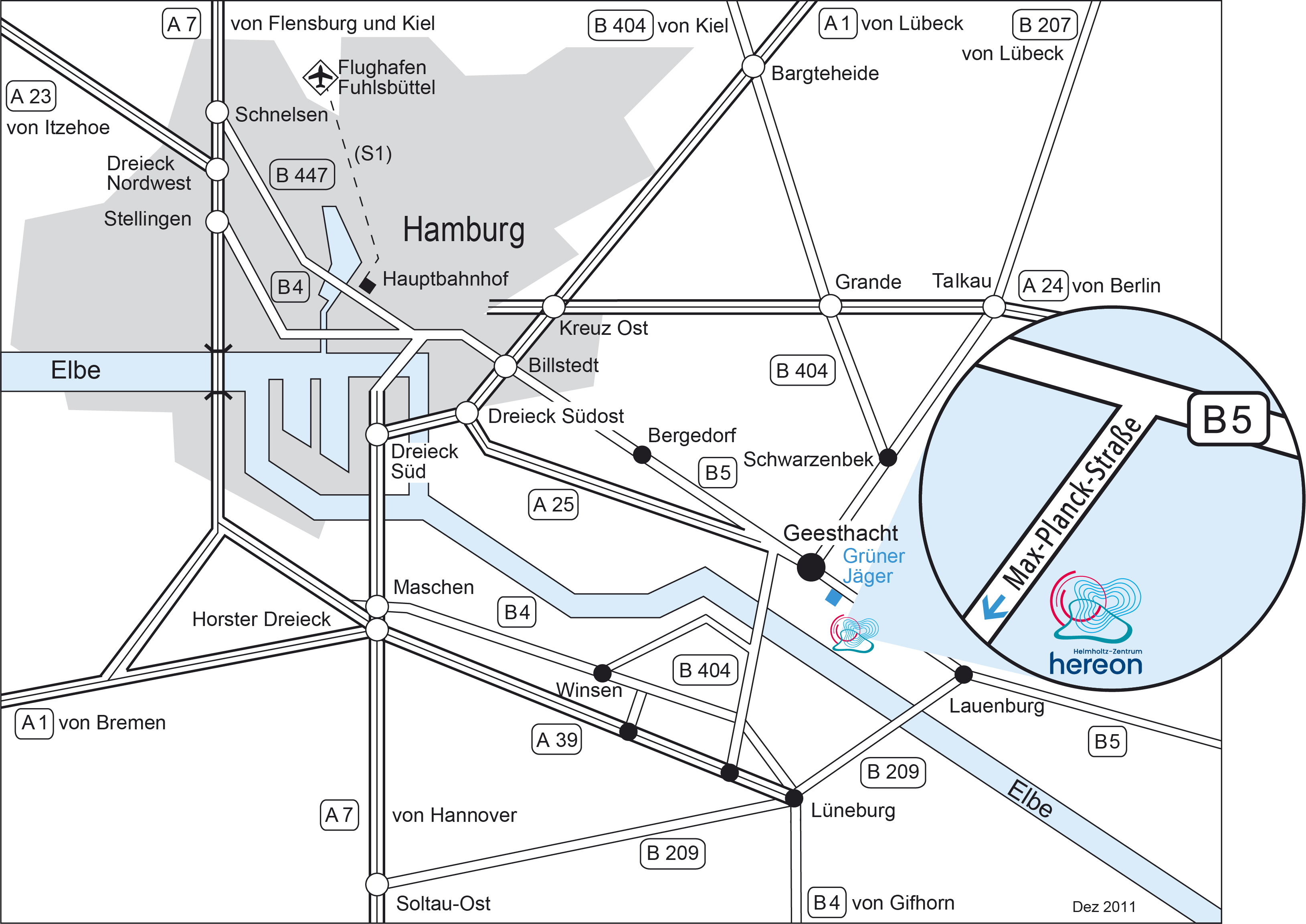 In den meisten Routenplanern führt die Eingabe von "Max-Planck-Straße" zu einer fehlerhaften Routenführung. Geben Sie deshalb als Zielort "Geesthacht / Grüner Jäger" ein.