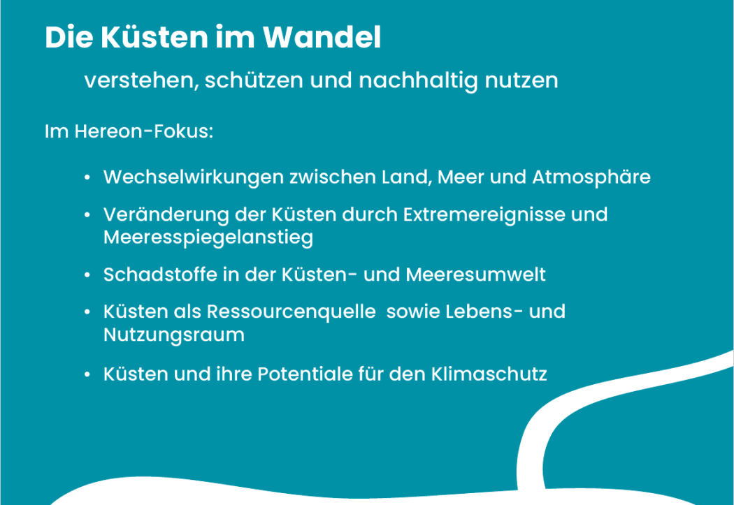 Darüber hinaus werden Biomaterialien für die Medizin und zur Steigerung der Lebensqualität erforscht. Mithilfe von Forschung und Beratung begegnet das Hereon den Herausforderungen des Klimawandels lösungsorientiert und ermöglicht über ein umfassendes wissenschaftliches Verständnis ein nachhaltiges Management und den Schutz der Küsten- und Meeresumwelt.