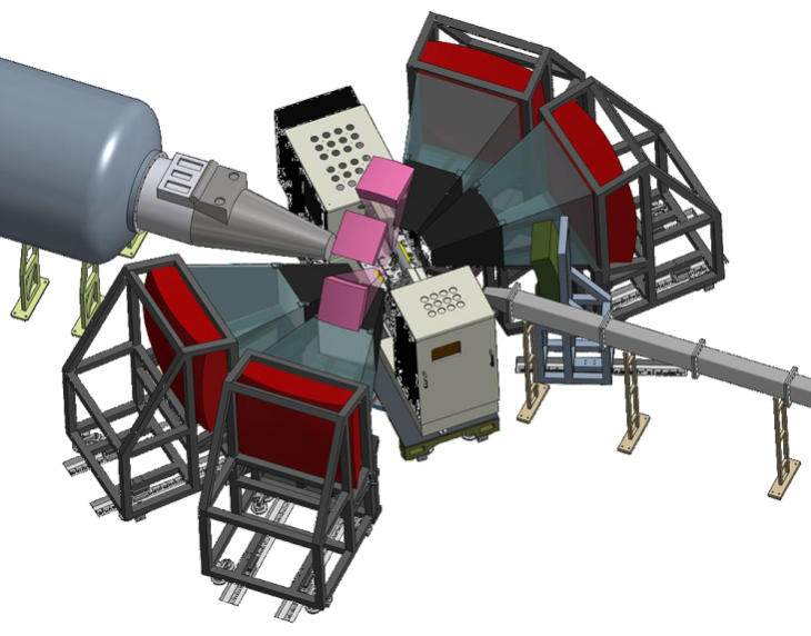 Der Probenort von BEER mit der Proben-umgebung GLEEBLE und den seitlichen Detektoren (rot), sowie dem Detektorbogen (magenta) und dem SANS-Streurohr.