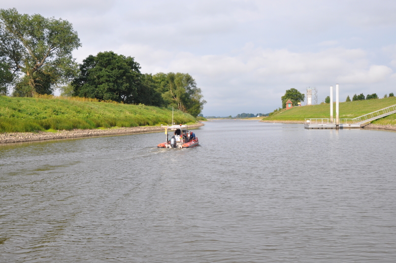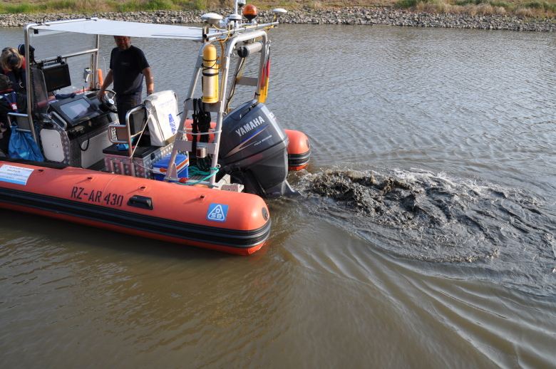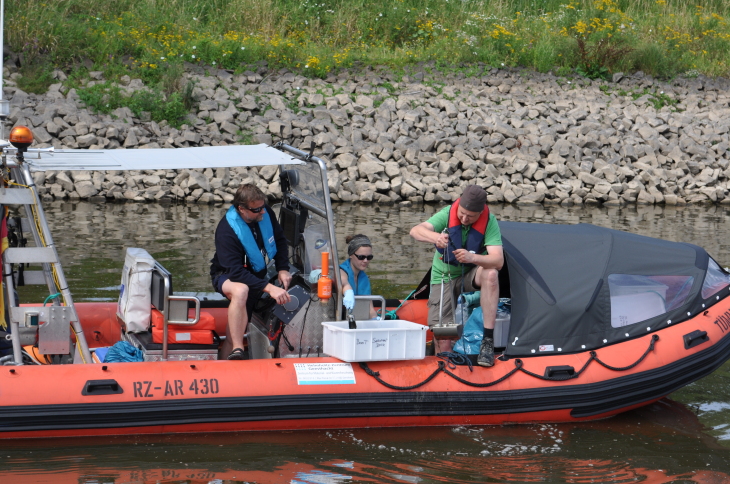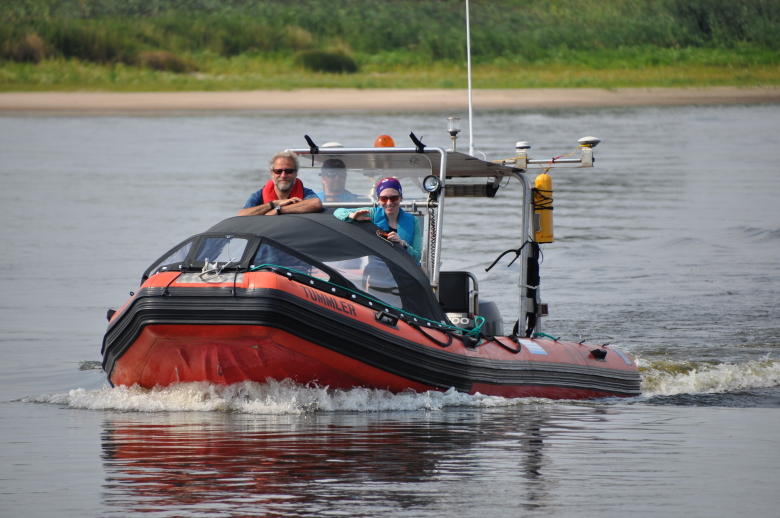 Nach dem Wehr in Geesthacht reichte der Wasserstand in der Elbe nicht mehr aus, um diese mit der "Ludwig Prandtl" befahren zu können. Wir stiegen in ein Schlauchboot um. Die Probennahme erfolgte vom Boot aus und ein Begleitfahrzeug sorgte für die Abnahme der Proben und den Nachschub. Die Proben wurden täglich zur schnellen Bearbeitung nach Geesthacht ins Labor transportiert.