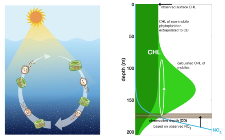 Links: Vertikale Migration des Phytoplanktons (PVM) als adaptives Verhalten zur Ressourcenbeschaffung im weit verbreiteten Fall einer Nährstoffverknappung an der Oberfläche. Durch den Abstieg in die Chemokline in größerer Tiefe akkumulieren autotrophe Zellen interne Nährstoffspeicher, während sie nach dem Aufstieg in den sonnenbeschienenen oberen Ozean Energie und Kohlenstoff gewinnen. Rechts: 1D-Lagrangsches Modell für die Entstehung des Chlorophyllmaximums (CHL) an der Oberfläche aufgrund von PVM.