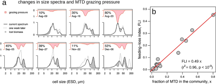 Auswirkungen des Weidens von mixotrophen Dinoflagellaten (MTD) auf das Größenspektrum des Phytoplanktons. (a) Veränderungen des Größenspektrums und des potenziellen Fraßdrucks durch MTD, wenn der Anteil der MTD an der Gesamtbiomasse 10 % übersteigt (Wert in der oberen linken Ecke). (b) Dieser Anteil von MTD in der Gemeinschaft (x) ist ein sehr guter linearer Prädiktor für den Fütterungsverlustindex (FLI, Überschneidung von Weidedruck und verlorener Biomasse).