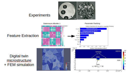 The interplay between microstructural alloy aspects and chemical/electrochemical reactions in the fluid phase and at the interface is key for capturing critical aspects of the corrosion. We use a combinative statistical, machine learning and Finite Element Method approach for modelling the problem cases at Hereon whereas the experimental part is conducted by TU Darmstadt partners.