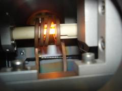 Induktive Heizung und glühende TiAl-Probe in der in-situ Probenumgebung FlexiTherm